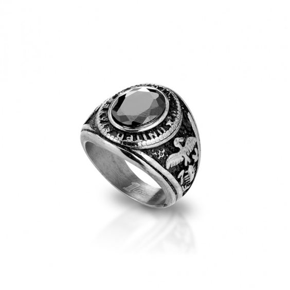 Anello chevalier in acciaio 316L ipoallergenico con pietra tonda nera centrale e finitura vintage con araba fenice laterale