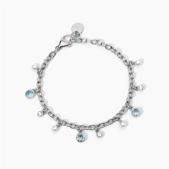 Bracciale in acciaio 316L con catena forzatina 4 mm, acquamarina sintetica Ø 5 mm, perle conchiglia Ø 4 mm e cristalli bianchi Ø 3 mm, lunghezza regolabile da 16 a 19 cm