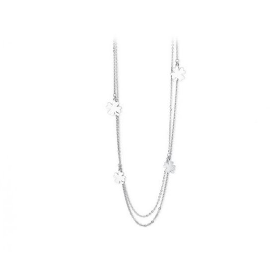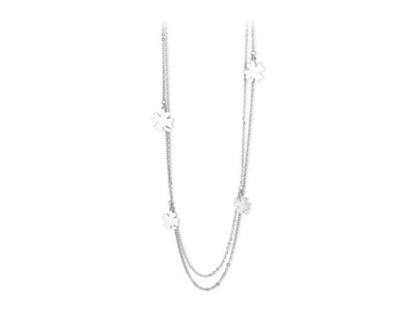 Collana lunga donna in acciaio, doppia catena maglia rolò , lunghezza cm 90 (la più corta) , cm 95 (la più lunga) , 6 quadrifogli pendenti.