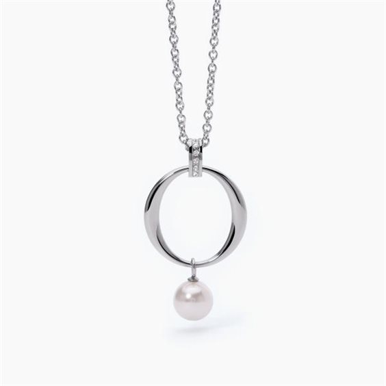 Girocollo in acciaio 316L con catena forzatina 2.3 mm, perla conchiglia Ø 10 mm, cristallo Ø 1.5 mm e pendente tondo Ø 26 mm, lunghezza regolabile da 40 a 45 cm.