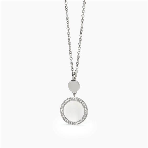 Girocollo in acciaio 316L con catena forzatina 2 mm, disco lucido Ø 8 mm, disco madreperla Ø 18 mm e cristalli Ø 1.25 mm, lunghezza regolabile da 40 a 45 cm