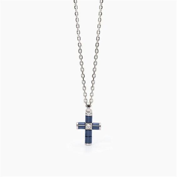 Collana in acciaio 316L con catena forzatina 2 mm e pendente croce 14x18 mm con ceramica blu e cristallo Ø 2.5 mm, lunghezza regolabile da 45 a 50 cm