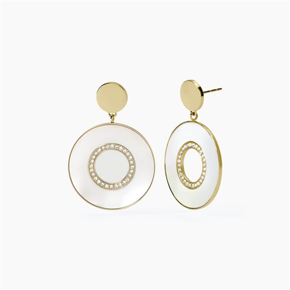 Orecchini in acciaio 316L in PVD giallo con disco lucido Ø 10 mm, disco madreperla Ø 27 mm e cristalli bianchi Ø 1.25 mm, lunghezza totale orecchino 4 cm