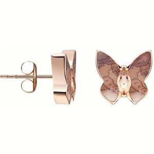 Orecchini da donna di Alviero Martini Prima Classe della collezione Papillons. Orecchini a bottone in acciaio con finitura in oro rosa, stampa geo map e cristalli. Chiusura: moschettone. Simbolo: farfalla.