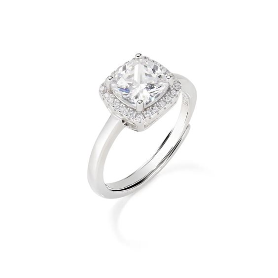 Anello Lady Regolabile con Zircone Bianco Taglio Radiant Anello regolabile in argento 925 rodiato con zircone bianco centrale taglio radiant da 7 x 7 mm contornato da piccoli zirconi bianchi.