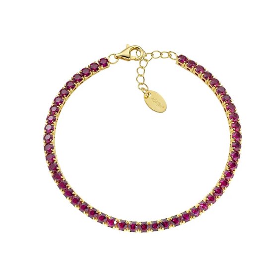 Bracciale Tennis 3 mm Dorato con Zirconi Rossi Bracciale tennis in argento 925 dorato con zirconi rossi da 3 mm. Lunghezza regolabile da 17 a 20 cm con catenina di allungo e chiusura a moschettone