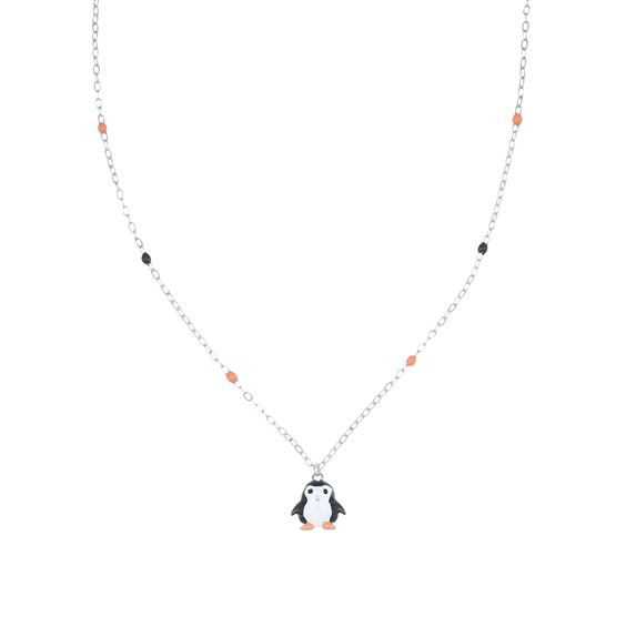 Collana Junior con Pinguino in Argento e Smalto Collana in argento 925 rodiato con pendente e smalto nero, bianco e arancione. Lunghezza regolabile da 35 a 39 cm, chiusura a moschettone.