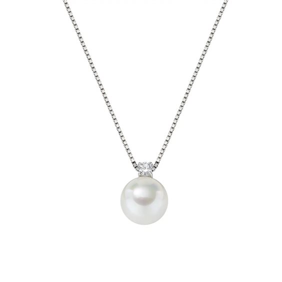 Collana in Argento con Perla Freshwater 10 mm e Zircone Bianco Collana in argento 925 rodiato con zircone punto luce e perla freshwater da 10 mm. Lunghezza regolabile da 40 a 45 cm con catenina di allungo e chiusura a moschettone. La lunghezza totale del ciondolo è 1,2 cm, la perla misura 10 mm e lo zircone punto luce 2 mm