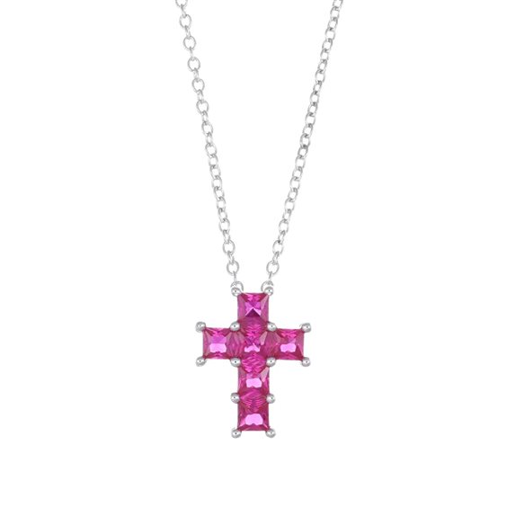 Collana Croce di Zirconi Rubino Collana in argento 925 rodiato con croce di zirconi rosso rubino taglio carré. Lunghezza regolabile da 38 a 42 cm con chiusura a moschettone. La croce è lunga 1,1 cm.