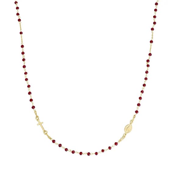 Rosario Girocollo Dorato con Cristalli Rossi Rosario girocollo in argento 925 con grani da 3 mm di cristalli rossi sfaccettati, croce e medaglietta rappresentante la Madonna Miracolosa. La collana ha lunghezza regolabile da 50 a 52 cm con chiusura a moschettone e catenina di allungo.