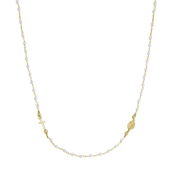 Rosario Girocollo Dorato con Perle di Cristallo Rosario girocollo in argento 925 con grani da 3 mm di perle di cristallo bianche, croce e medaglietta rappresentante la Madonna Miracolosa. La collana ha lunghezza regolabile da 50 a 52 cm con chiusura a moschettone e catenina di allungo.