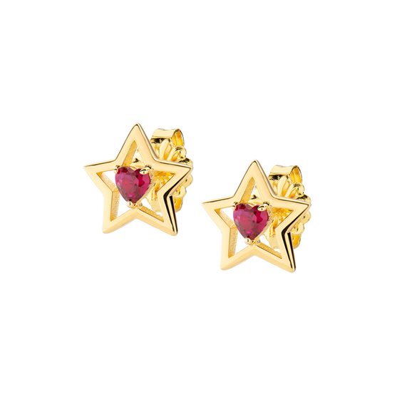 Orecchini Con Stella In Argento 925/°° Placcato In Oro Giallo E Zircone Rosso A Forma Di Cuore.