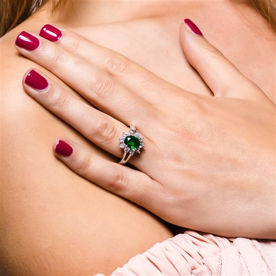 Anello Lady D Verde in argento rodiato 925%, con pietra verde smeraldo contornato da zirconi, del Brand Anellissimi.