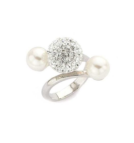 Anello contrariè in argento rodiato con perle (diametro mm 10) e boules in pavé di strass. Autoregolabile fino a 2 misure in aumento o in diminuzione.