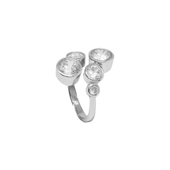 Anello aperto in argento rodiato con decoro di zirconi taglio diamante. Regolabile fino a 2 misure in aumento o in diminuzione.