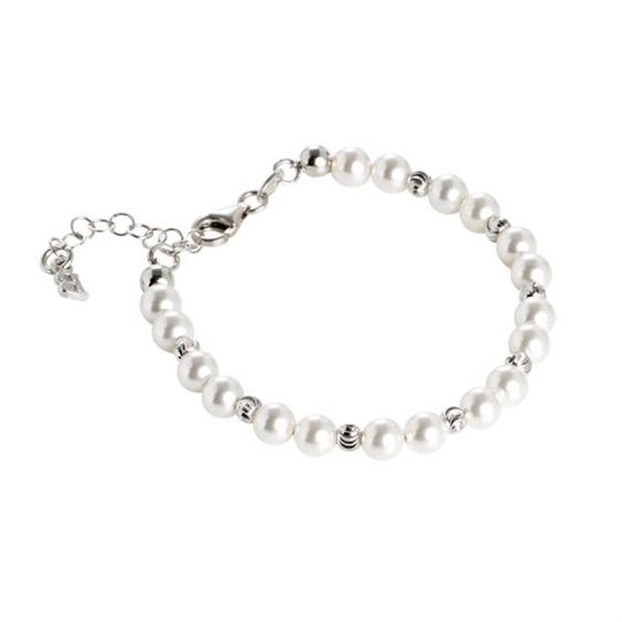 Bracciale con perle Swarovski alternate a sfere diamantate Bracciale in argento rodiato con filo di perle Swarovski bianche (diametro mm 6) alternate a passanti in argento diamantato dall'effetto ondulato. Lunghezza cm 17, estendibile fino a cm 20,5.