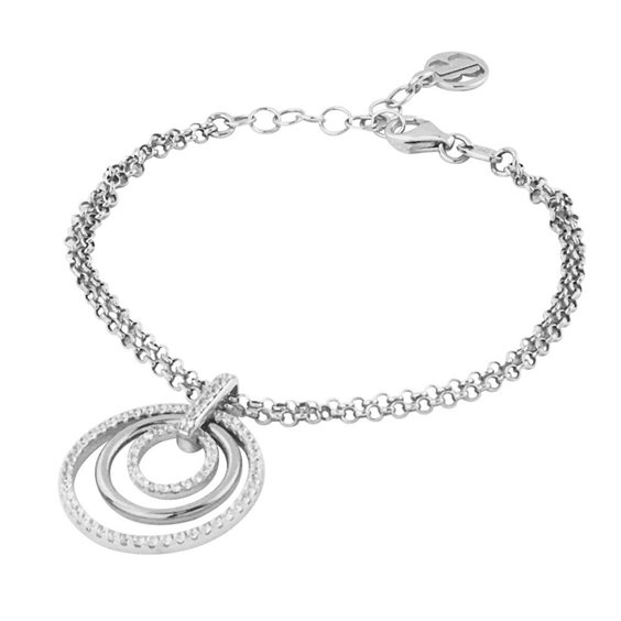 Bracciale doppio filo in argento rodiato con charm composto da cerchi concentrici dalla superficie liscia e di zirconi (diamensione cm 2,2 x 2,5). Lunghezza cm 17, estendibile fino a cm 20.