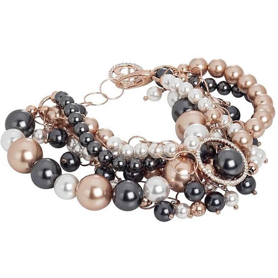 Bracciale rosato con fili di perle Swarovski e zirconi. Bracciale in argento placcato oro rosa con fili di perle Swarovski intrecciati black, rose gold e white, con elementi decorativi in zirconi. Lunghezza cm 18, estendibile fino a cm 21,5.