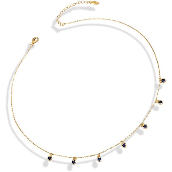 Collana in argento placcato oro giallo con zirconi pendenti incastonati colore blu montana taglio cuore. Misure: lunghezza regolabile da cm 39 a cm 44