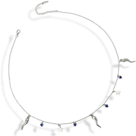 Collana In Argento Con Cornetti Portafortuna Pendenti, Charms Cuori Di Zirconi Colore Blu Montana E Stelle Misure: Lunghezza Cm 39, Estendibile Fino A Cm 44,5
