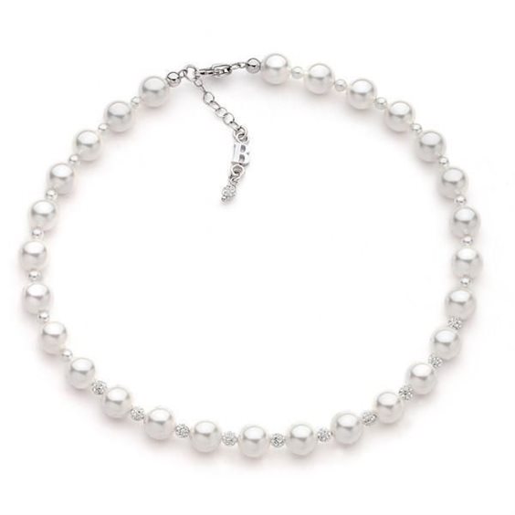 Collana in argento rodiato con filo di perle bianche (diametro mm 10) alternate a piccole boules in pavè di strass. Lunghezza cm 40, estendibile fino a cm 45.