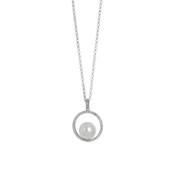 Collana in argento rodiato con pendente circolare in pavè di zirconi (lunghezza cm 3) e perla bianca Swarovski interna (diametro mm 12). Lunghezza cm 38, estendibile fino a cm 43,5.