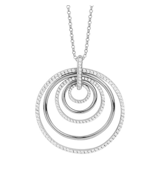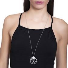 Collana lunga con pendente a cerchi alternati argento e cristalli swarovski. Possibilità di duplice indosso lunga e doppio filo a cm. 41. catena rolo'.