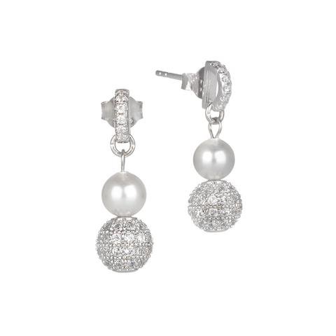 Orecchini in argento rodiato con chiusura a farfalla composta da perno in zirconi, perla bianca Swarovski (diametro mm 6) e boule finale in argento e zirconi. Lunghezza cm 2,5.