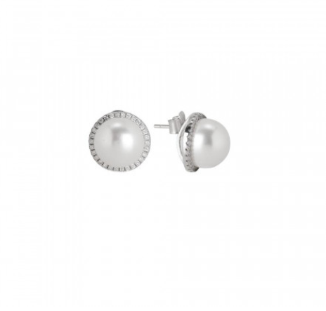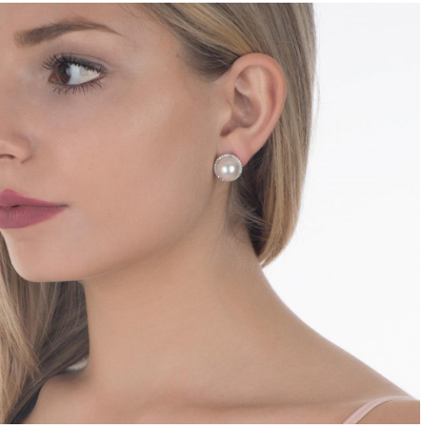 Orecchini Boccadamo con perla Swarovski certificata e contorno di cristalli bianchi. Dimensione perla mm.12 orecchino completo mm. 15. chiusura a perno farfalla.
