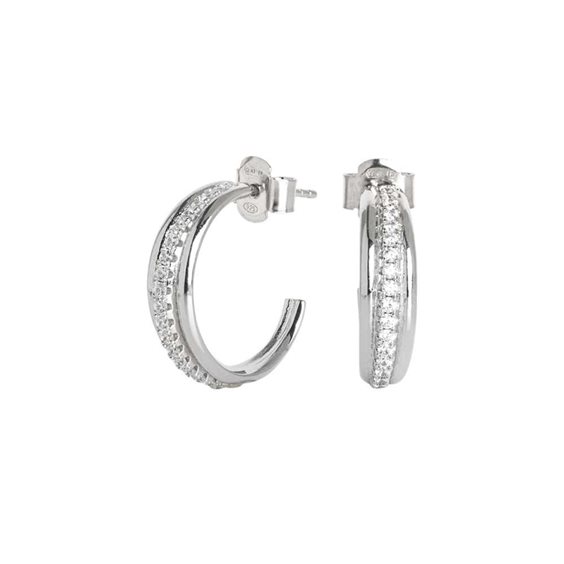 Orecchini mezza luna in argento rodiato con perno a farfalla e superficie decorata da pavè di zirconi (diametro cm 1,8).