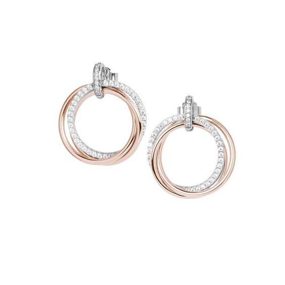 Orecchini a cerchio in argento placcato oro rosa (diametro cm 2,5) dal perno a farfalla e con cerchio di zirconi. Lunghezza cm 3.
