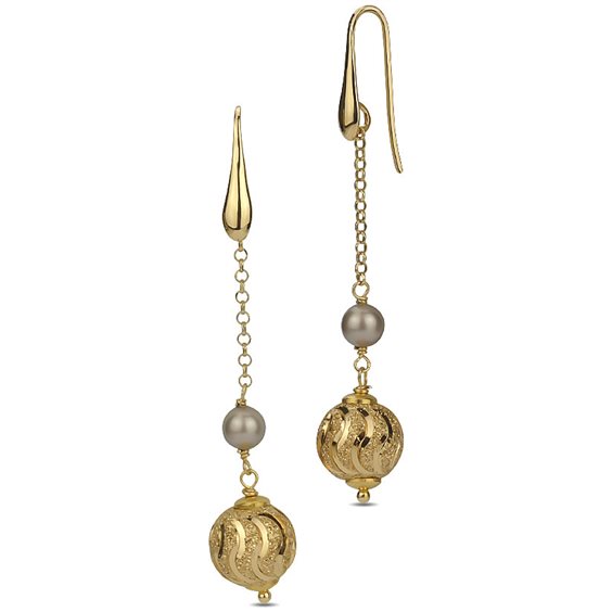 Orecchini monachella con perla color platinum e boule dall'effetto diamantato pendente. Misura: lunghezza cm 6,5 Dimensione: diametro perla mm 6 Chiusura: monachella