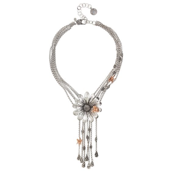 Collana multifilo in argento brunito con margherita centrale che ospita un'ape in argento placcato oro rosa e frange in argento brunito decorate da nidi di ape e ape placcata oro rosa. Misure: collana regolabile da cm 37,5 a cm 42,5 Dimensione: decoro centrale con margherita diametro cm 5, lunghezza massima delle frange cm 8 Chiusura collana: con moschettone