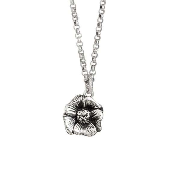 Collana in argento brunito con fiore di ciliegio pendente. Misure: collana regolabile da cm 40 a cm 45,5 Dimensione: fiore di ciliegio pendente diametro cm 1,5, lunghezza cm 2,5 Chiusura collana: con moschettone