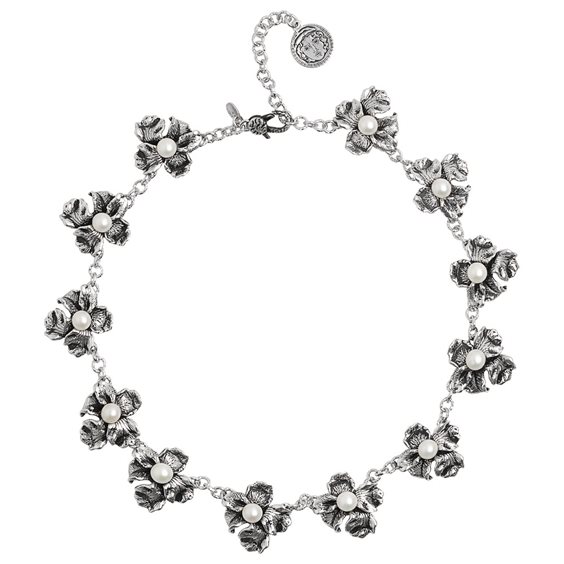 Collana con moduli in argento brunito composti da fiori di iris e perle naturali diametro cm 0,6. Misure: collana regolabile da cm 39 a cm 44,5 Dimensione: fiori di iris cm 2,5x2,5 Chiusura collana: con moschettone