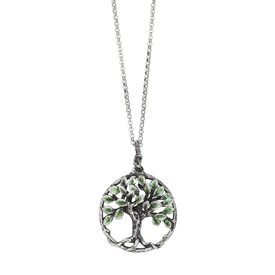 Collana in argento brunito con pendente circolare decorato internamente da un albero della vita dipinto a mano con la tecnica della micro pittura. Misure: collana lunga cm 84 Dimensione: pendente circolare diametro cm 4, lunghezza cm 5,5 Chiusura collana: con moschettone