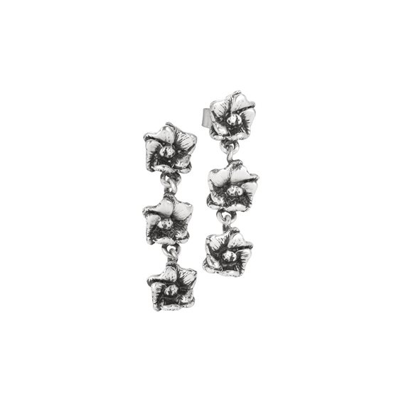 Orecchini con pendente composto da tre fiori di ciliegio in argento brunito. Misure: orecchini pendenti lunghezza cm 3,5 Dimensione: fiore di ciliegio diametro cm 1 Chiusura orecchini: a farfalla