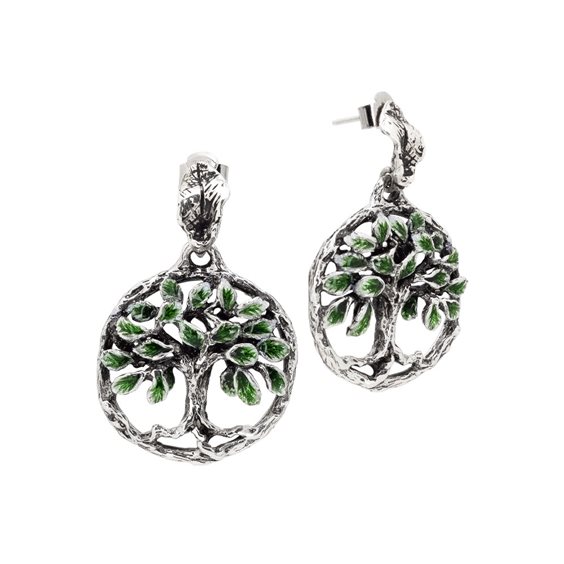 Orecchini a cerchio in argento brunito con decoro interno composto da un albero della vita dipinto a mano con la tecnica della micro pittura. Misure: orecchino lunghezza cm 4 Dimensione: decoro a cerchio con albero della vita diametro cm 3 Chiusura orecchini: a farfalla