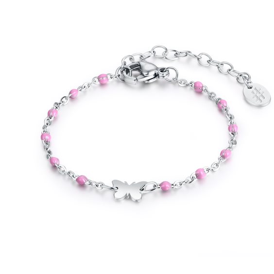 Bracciale bimba con farfalla e catena drop viola Materiale: acciaio inossidabile, smalto Lunghezza bracciale: 12 cm + 4 cm di estensione