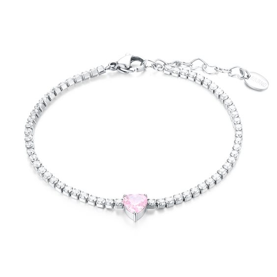 Bracciale tennis cuore rosa - Bracciale tennis 2mm con cristallo a forma di cuore rosa Lunghezza: 16cm + 3 cm di estensione Materiale: acciaio ipoallergenico e inossidabile