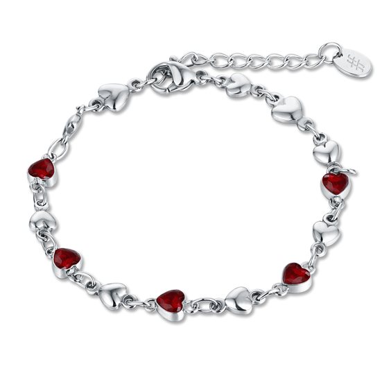 Bracciale catena a cuori e cristalli a cuore passanti rossi Materiale: acciaio inossidabile, cristalli Dimensione cristallo: 4 mm Lunghezza bracciale : 16 cm + 3 cm di estensione