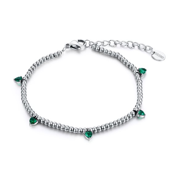 Bracciale a sfere con cinque cristalli a cuore pendenti verdi Materiale: acciaio inossidabile, cristalli Dimensione cristallo: 3,6 mm Dimensione sfere: 2,5 mm Lunghezza bracciale : 16 cm + 3 cm di estensione