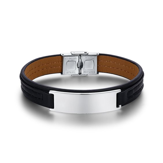 Bracciale nero in pelle con targa in acciaio Materiale: acciaio inossidabile, ipoallergenico testato per il nichel e pelle Spessore pelle: 2,8 mm
