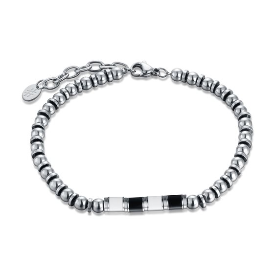 Bracciale in acciaio inossidabile e ipoallergenico ed ematite rodiata, con barilotti smaltati di colore Bianco Nero lunghezza bracciale: 19cm + 3cm di estensione misura L 13cm + 3cm di estensione misura s