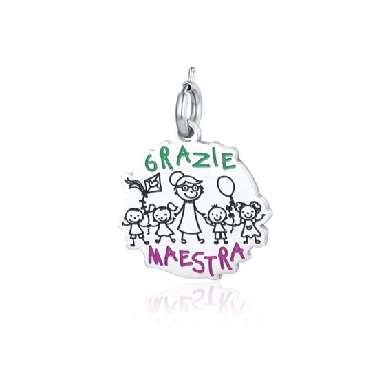 Charm “Grazie Maestra” Charm con scritta smaltata “Grazie Maestra” Materiale: acciaio inossidabile testato per il nichel Diametro charm: 1,5 cm