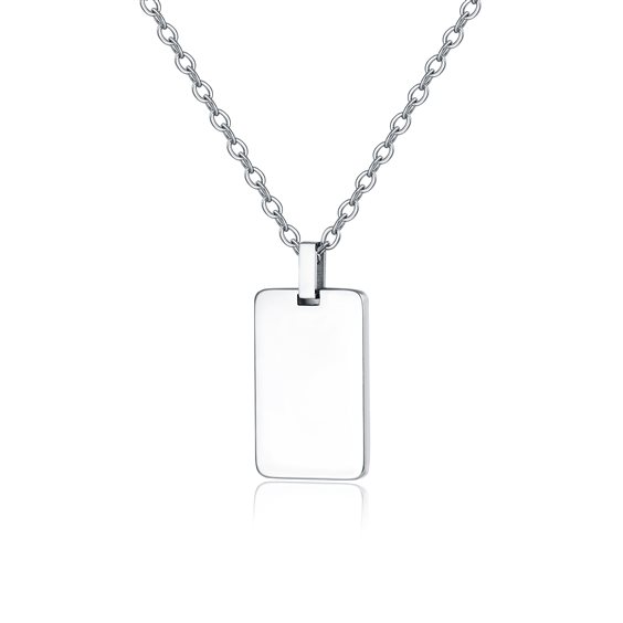 Collana con targa in acciaio Materiale: acciaio inossidabile, ipoallergenico testato per il nichel Grandezza targa: 1,3 cm x 2 cm Lunghezza collana: 55 cm + 5 cm di estensione