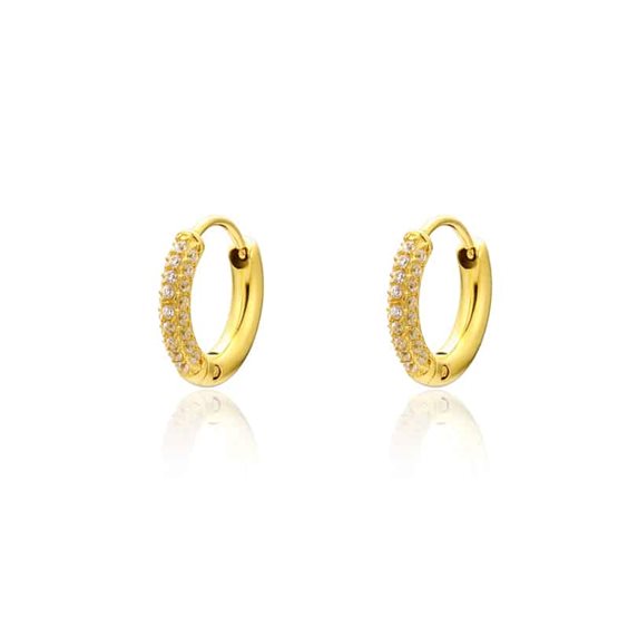 Orecchini Cerchio 14 mm con Cristalli Orecchini a Scattino con Cristalli Bianchi Diametro esterno: 1,4 cm Spessore: 2,5 mm Finitura: PVD Oro Materiale: Acciaio inossidabile ed ipoallergenico e cubic zirconia