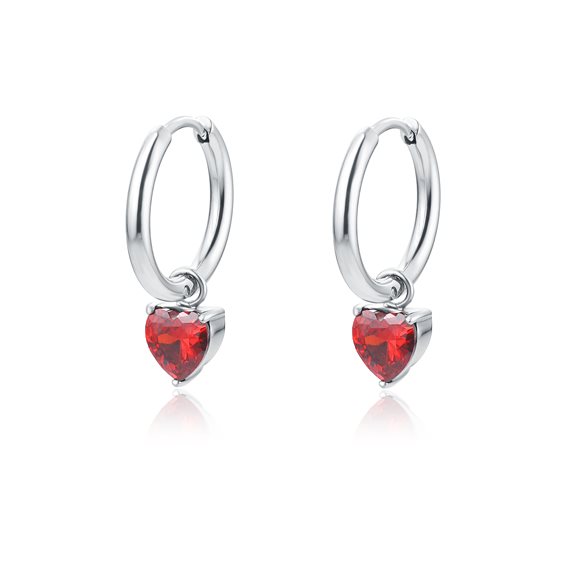 Orecchini cerchio cuore rosso - Coppia di orecchini a cerchio con pendente di cristallo a forma di cuore dimensione 6 mm x 6 mm. Diametro cerchio: 16mm Materiale: acciaio ipoallergenico Chiusura: a scatto