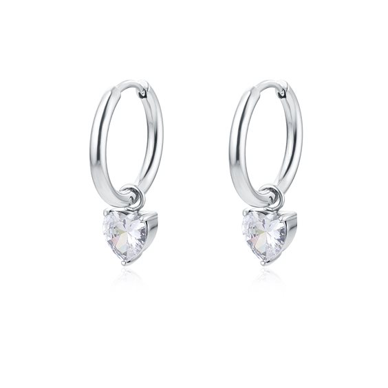 Orecchini cerchio con cuore bianco - Coppia di orecchini a cerchio con pendente di cristallo a forma di cuore dimensione 6 mm x 6 mm. Diametro cerchio: 16mm Materiale: acciaio ipoallergenico Chiusura: a scatto