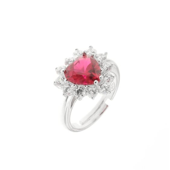 Anello in Argento 925 con zircone rosso rubino a forma di cuore impreziosito da zirconi bianchi - misura regolabile